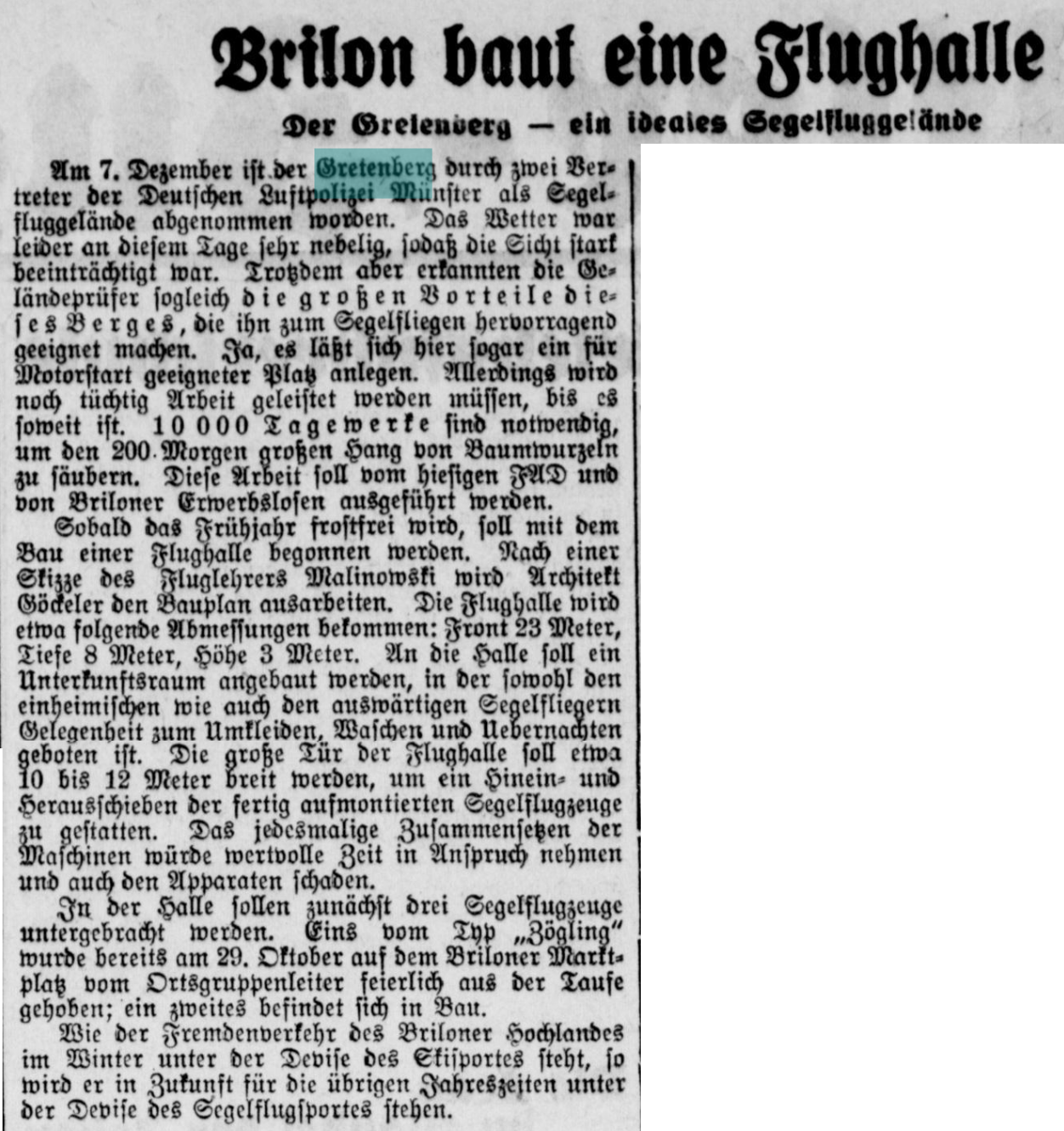 Im Jahre 1932 gründeten Karl Ernst, Hugo und Emil Malinowski, A. Hölscher, B. Hollekamp, die Herren Wrede, Haag und weitere eine Segelfluggruppe in Brilon.